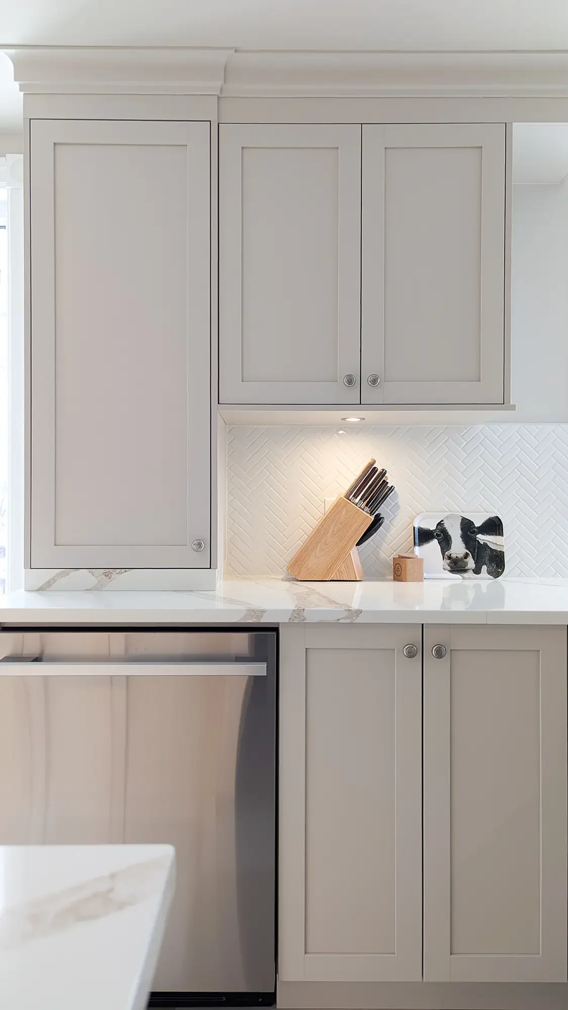 L’intervention a porté sur la conception complète de la cuisine, avec une attention particulière accordée à la circulation, aux volumes et à la lumière naturelle. L’îlot central, véritable cœur du projet, structure l’espace et favorise les échanges, tout en offrant une surface de travail généreuse et durable. Le choix des matériaux, notamment le quartz, les armoires sur mesure et le dosseret en céramique à motif chevron, contribue à créer une ambiance à la fois sobre, chaleureuse et raffinée.