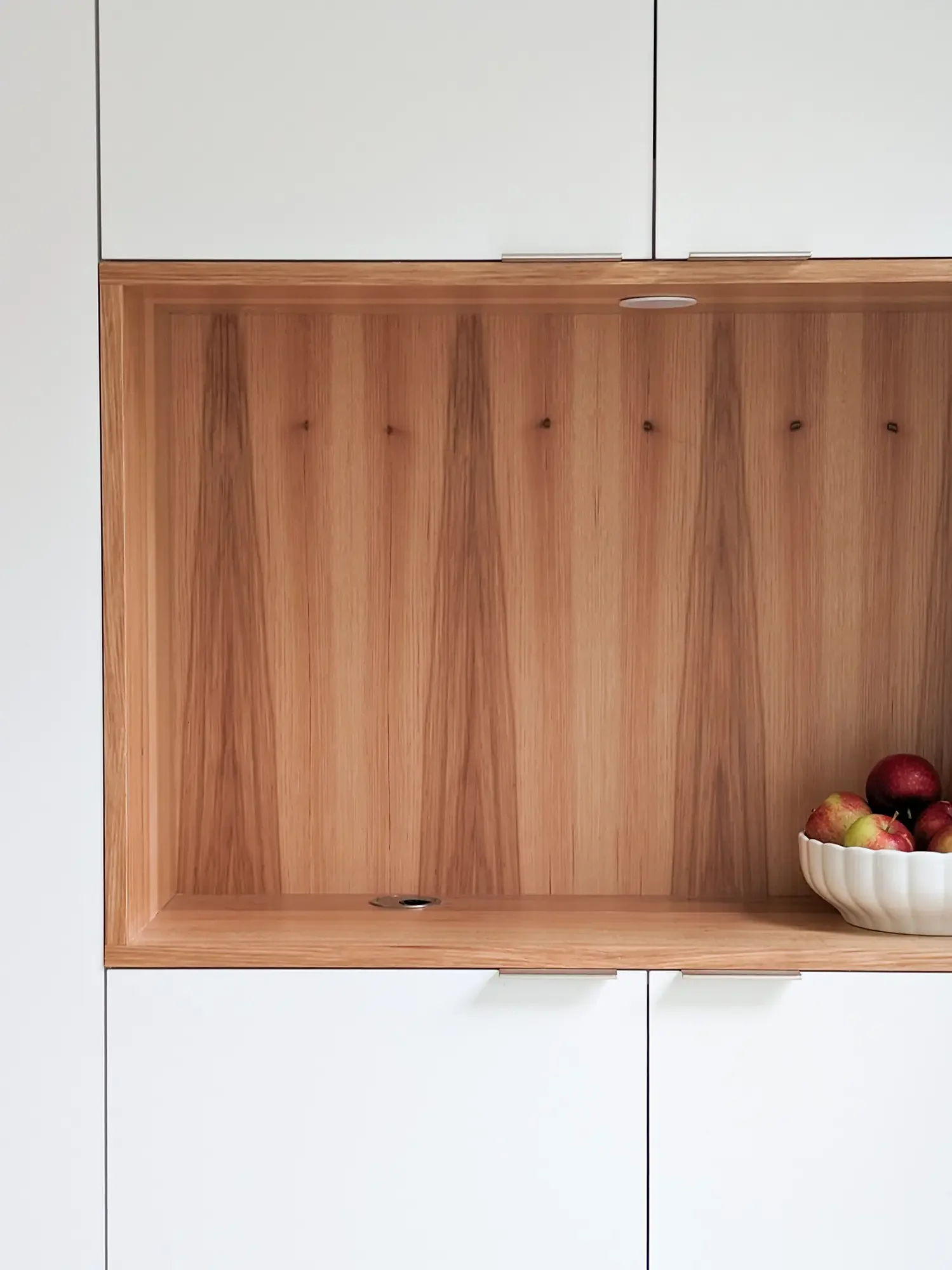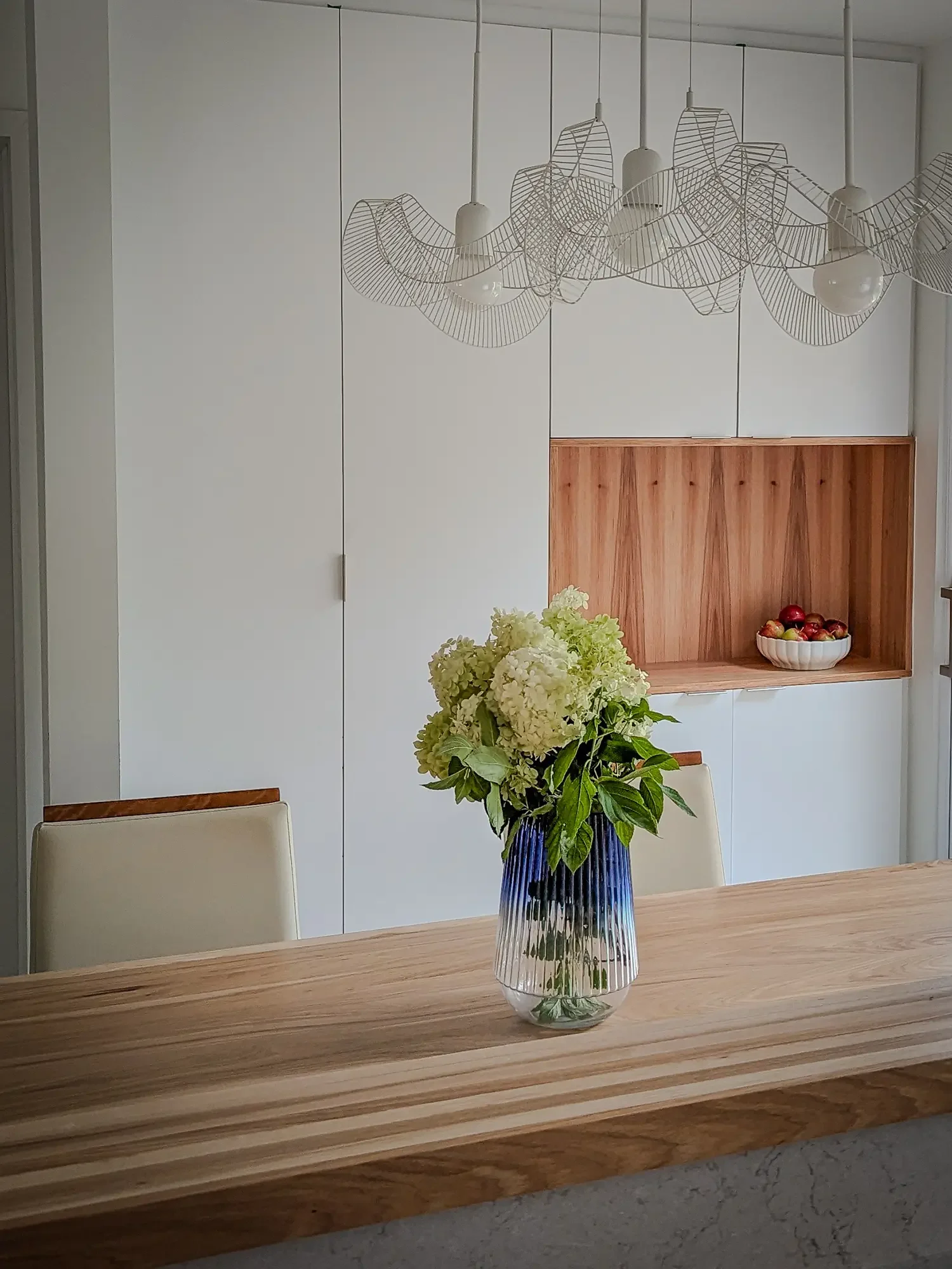 L’intervention a porté sur la reconfiguration des volumes et l’intégration de solutions sur mesure, favorisant une circulation naturelle et une lecture fluide de l’espace. Les matériaux ont été sélectionnés pour leur durabilité et leur texture : bois clair, surfaces minérales et finitions mates composent une palette cohérente, lumineuse et intemporelle.